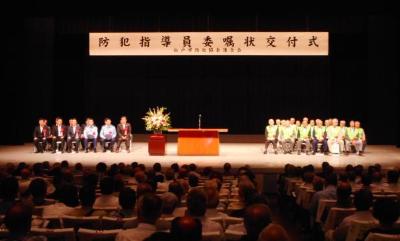 防犯指導員の任期は2年となっています。2年ごとに式典を開催し、新しく防犯指導員となった方、防犯指導員を継続する方へ委嘱状を交付しています。 (防犯指導員の新規登録は、各交番管内防犯協会長を通じて随時行っております。)