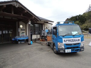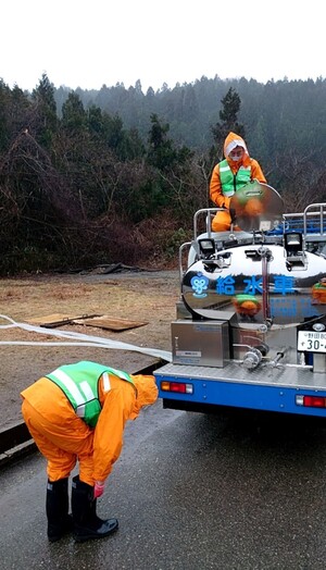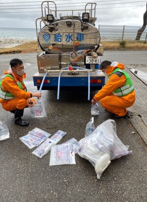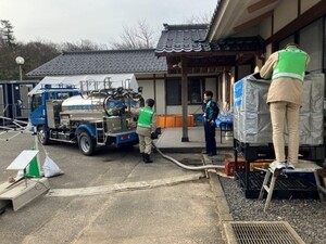 毎日、金沢市から輪島市の一部被災を免れた千原浄水場へ移動し、給水車(2トン)に応急給水用水を確保してから輪島市内の各避難所等へ給水活動を実施。